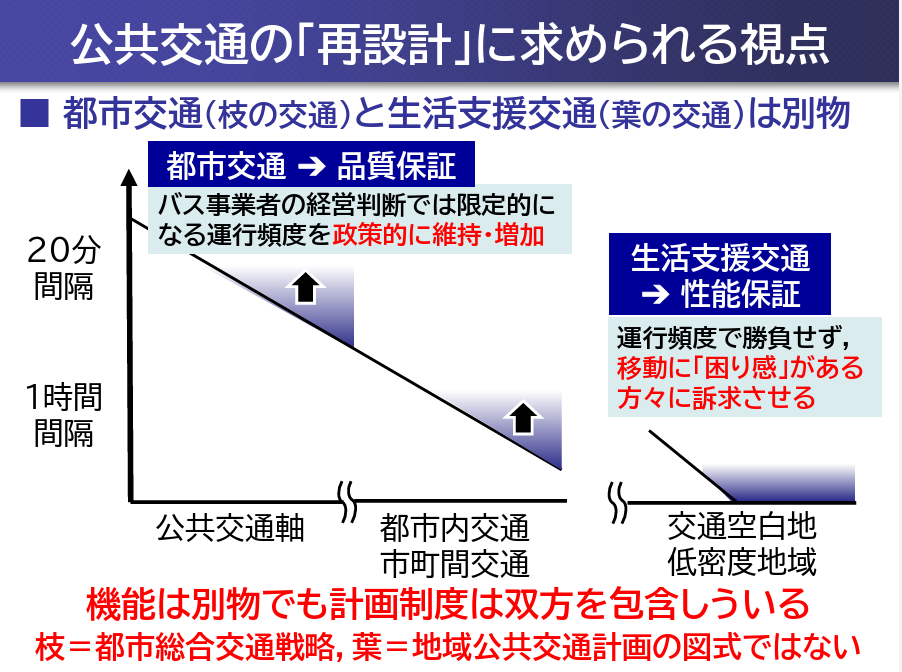 地域公共交通を特殊な政策領域とみなしすぎではないかと思う。もっといえば、地域公共交通を、その真髄を理解した「界隈」の中の専門家・技術者にしか扱えないものにしてしまっていないかと思う。地域公共交通をもっと一般的な、普遍的な問題として位置づけ、土木計画学はもちろんのこと、経済学・地方財政学・行政学のメインストリームの人に、メインストリームな手法を用いて扱っていただきたい。そう願って今日の講演を準備した。